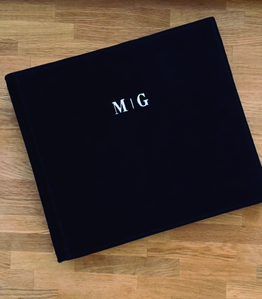 Un álbum en piel de serraje negro con las iniciales en color plata, diseñado y elaborado por artesanos en Ubrique (Cádiz).